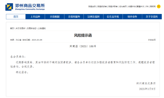 郑州商品往返所发布风险教导函称,近期影响菜粕、菜油商场的不笃定性成分较多,请各会员单元切实加强投资者讲解和风险疑望使命,提醒投资者感性参与,合规往返。