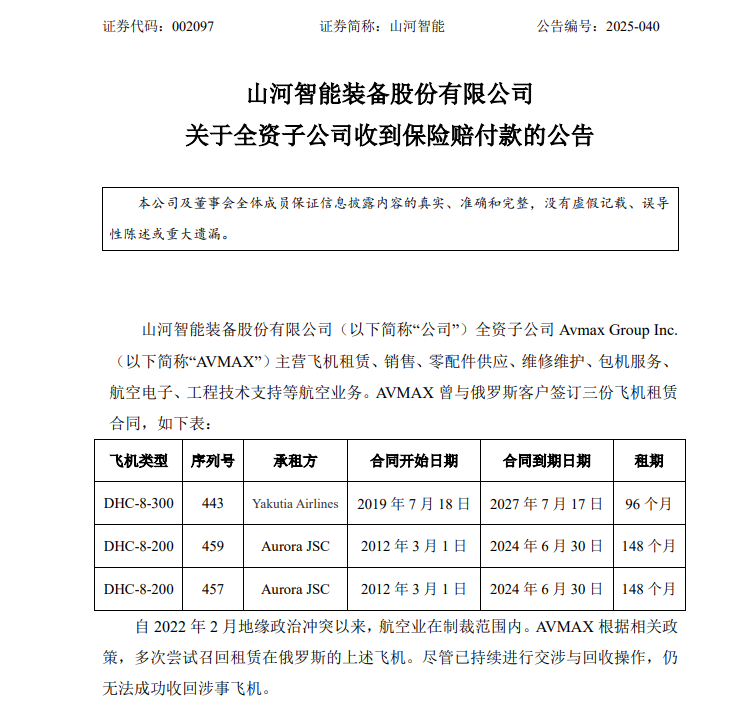 江山智能(002097)8月11日晚间流露,近日,公司全资子公司AVMAX与飞机保障承保东说念主就赔付决策达成一请安见,证据AVMAX可从保障承保商获取2900万好意思元保障理赔款。