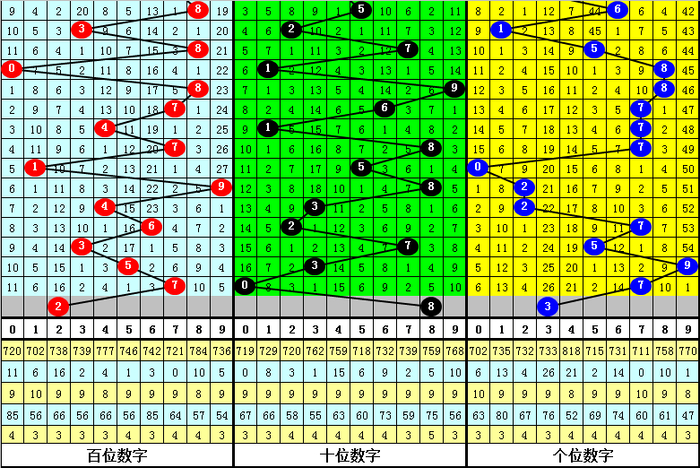 百位号码:前50期走势活跃的号码为:5、7开出8个,1、2开出6个;走势最冷的号码为:0开出2个,4、9开出3个。奖号012路比开出14:17:19,奇偶比开出30:20。本期百位杀排斥:1、4,珍重号码2、6、9,胆码参考2。